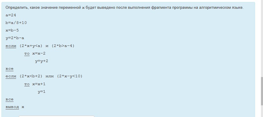 Определить, какое значение переменной x будет выведено после выполнения фрагмента программы на алгоритмическом языке a=24 b=a/8+10 x=b–5 y=2*b–a если (2*x+ya–4) то x=x–2 y=y+2 все если (2*x
