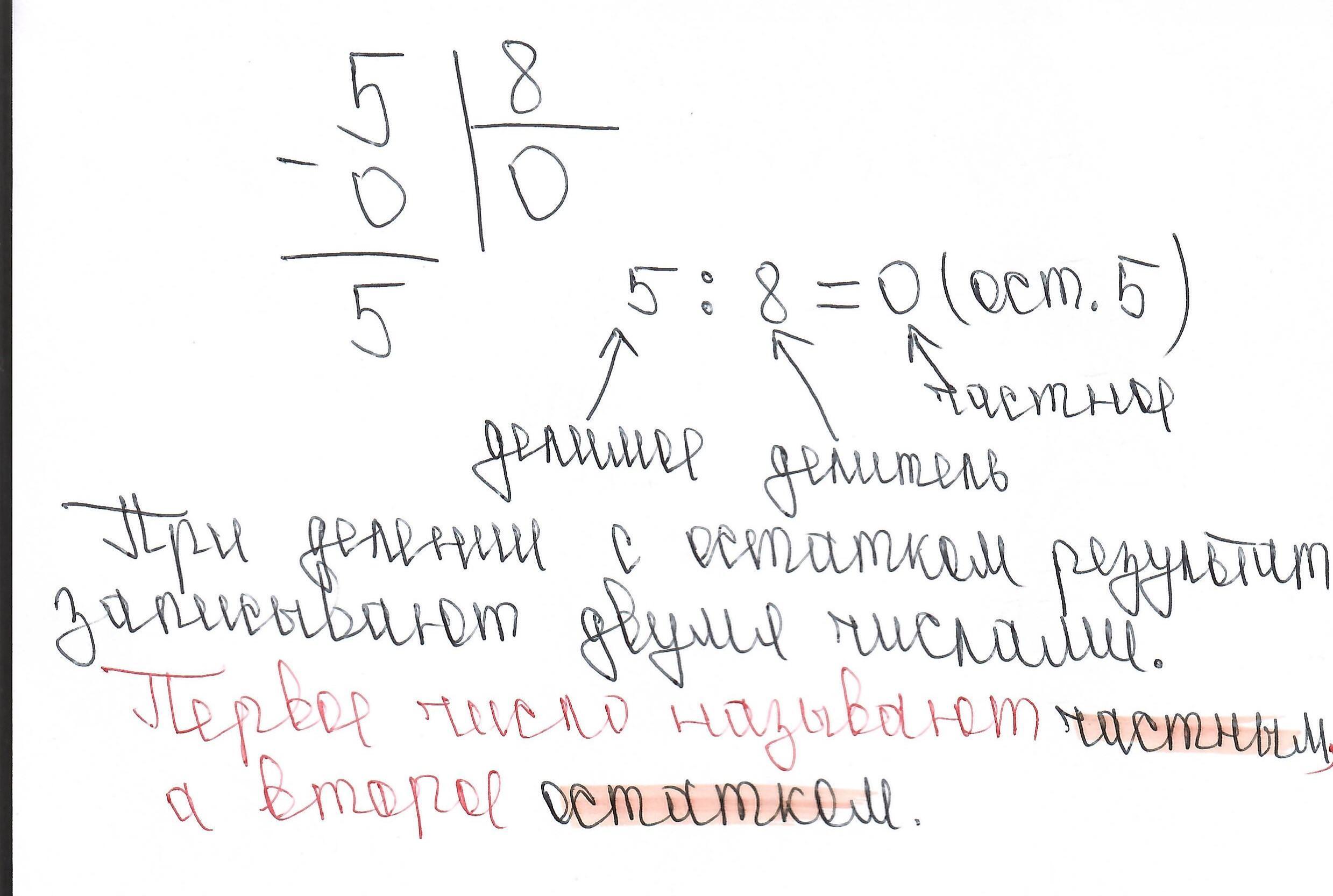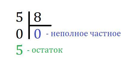5 : 8 = 0 (остаток 5), где 5 - делимое, 8 - делитель.