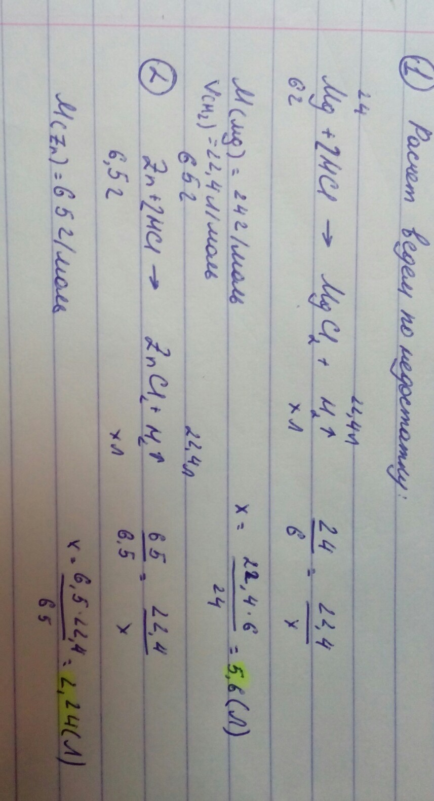 В избытке соляной кислоты растворить магний массой 6 г. и цинк массой 6.5 г.Какой объем водорода, измерений при нормальных условиях, выделиться при этом?