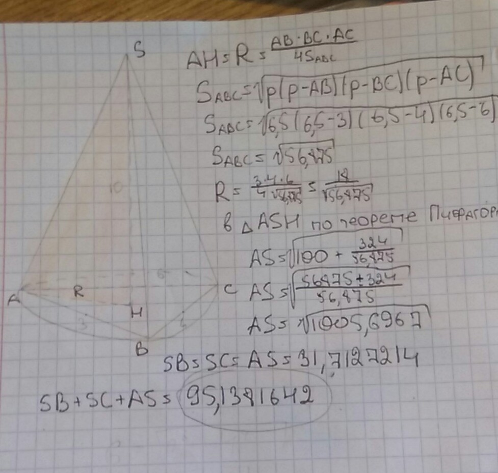 Помогите !!!!! В основании пирамиды SABC лежит треугольник со сторонами АВ=3, ВС=4,АС=6, Высота пирамиды SH равна 10 и Н- центр окружности , описанной около треугольника АВС. Найдите сумму боковых ребер пирамиды