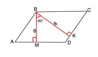 Обозначим параллелограмм АВСD. Высота ВМ=6 см, ВК=8 см, ∠МВК=60°