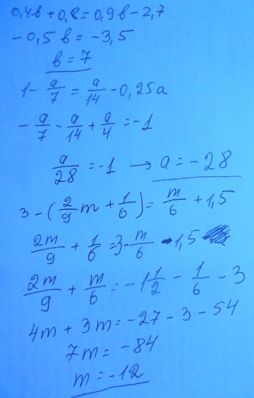 №к - предпоследняя строчка - проверьте 0,8у? Пример Г) 3 - (2/9m + 1/6) = m/3 + ( у вас m/6); третья строчка этого уравнения последняя цифра = + 3 ( у вас - 3). Пожалуйста, проверьте эти уравнения.