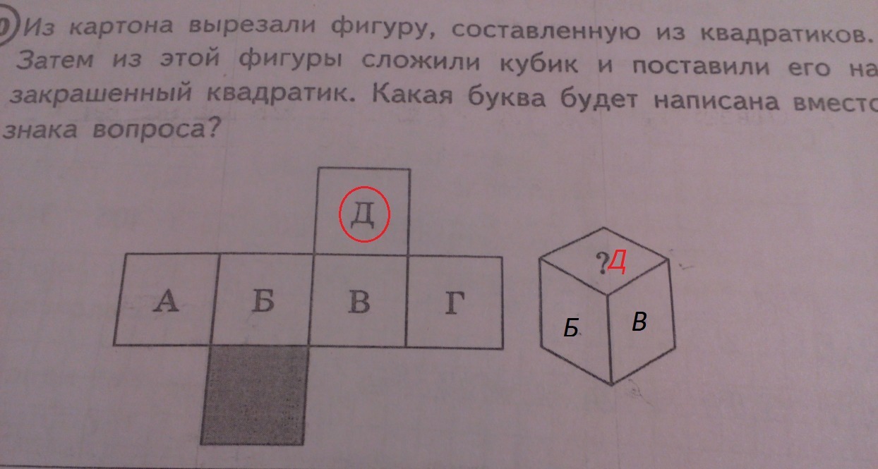 Из картона вырезали фигуру составленную из квадратиков,затем из этой фигуры сложили кубик и поставили его на закрашенный квадратик.какая буква будет написана вместо знака вопроса?