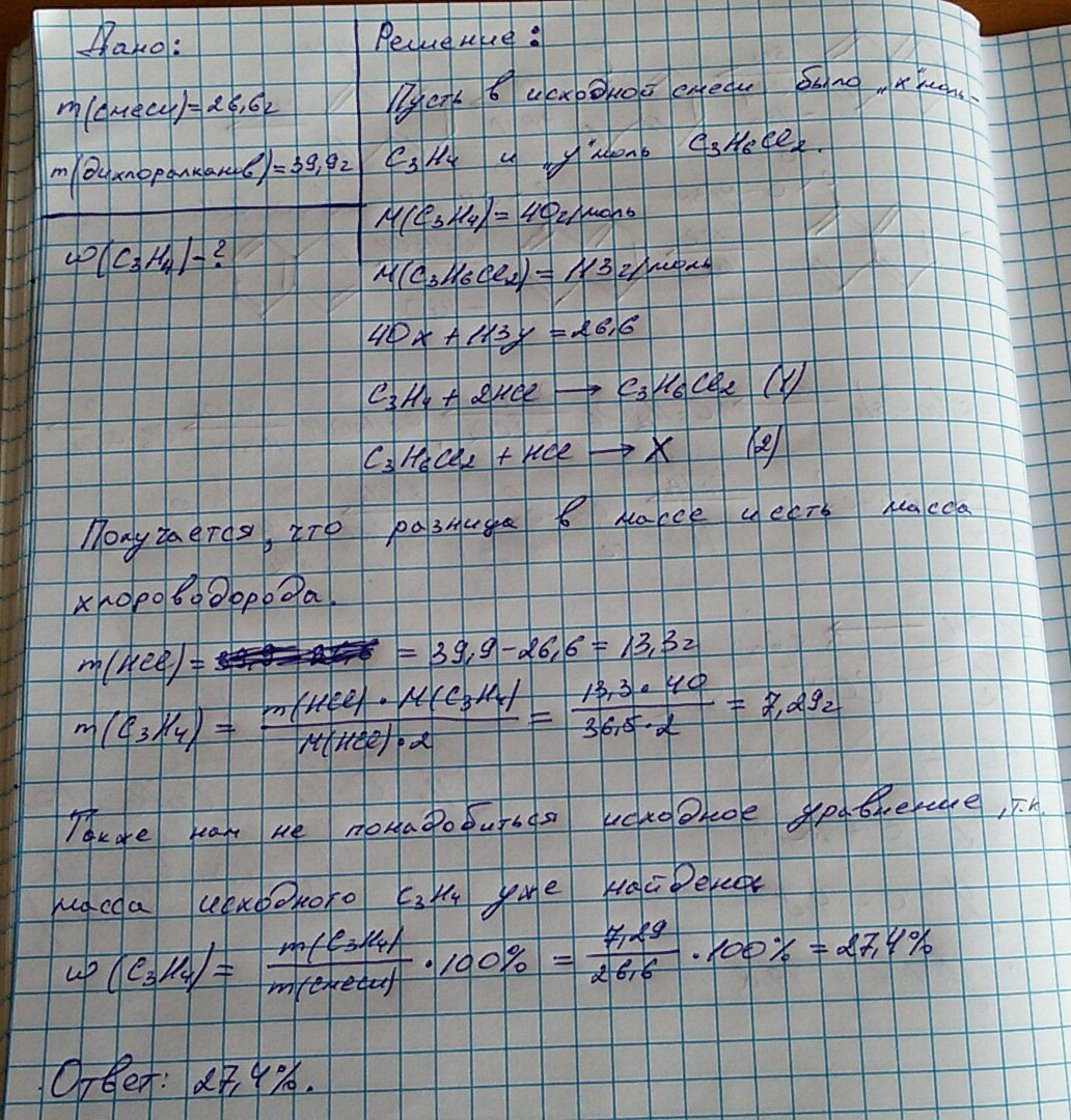 . Смесь пропина и 1,3-дихлорпропана общей массой 26,6 г обработали избытком хлороводорода в присутствии солей ртути. Масса изомерных дихлоралканов по окончании реакции оказалась равной 39,9 г. Вычислите массовую долю углеводорода в исходной смеси.