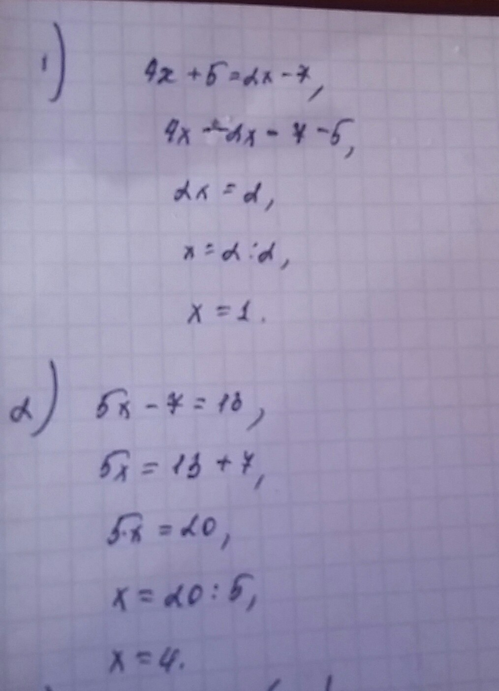 1) 4x+5=2x-7