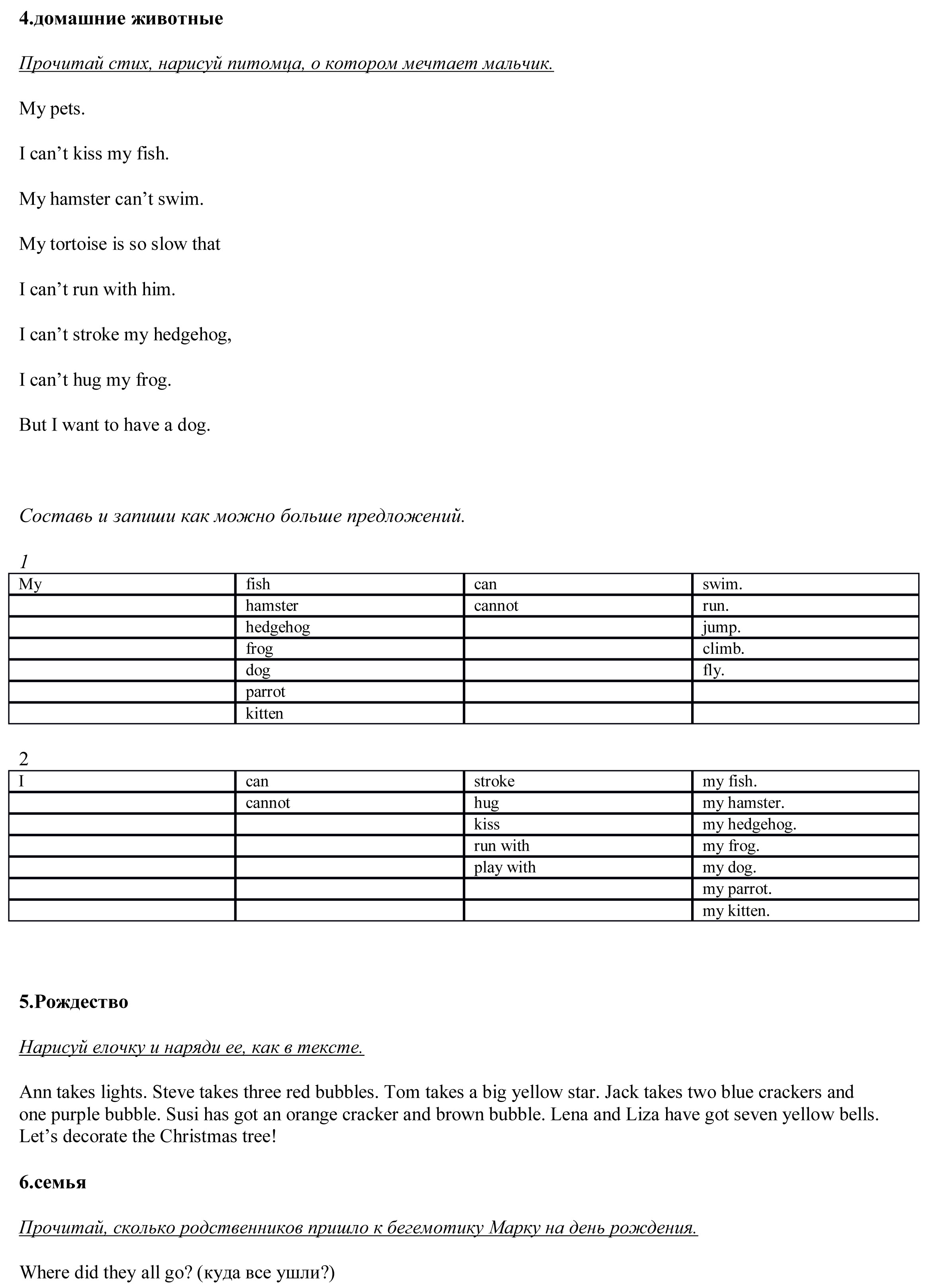 My hamster cannot fly.My hedgehog cannot climb. My frog can jump. My dog can run. My parrot cannot swim.My kitten can climb.