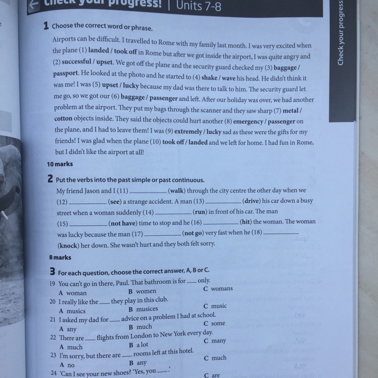 1) 1-landed, 2-upset, 3-passport, 4-shake, 5-lucky, 6-baggage, 7-metal, 8-passenger, 9-extremely, 10-took off