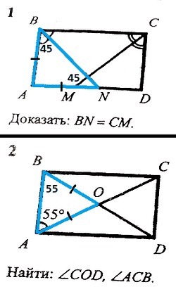 1) У прямоугольника все углы прямые. Биссектриса делит прямой угол на два угла по 45. Треугольник ABN - прямоугольный с углом 45, следовательно равнобедренный (другой острый угол равен 90-45=45, углы при основании равны), AB=AN. Аналогично СD=MD. Противоположные стороны прямоугольника равны: AB=CD. Прямоугольные треугольники ABN и MCD равны по двум катетам (AB=AN=СD=MD). Следовательно, их гипотенузы равны, BN=CM.