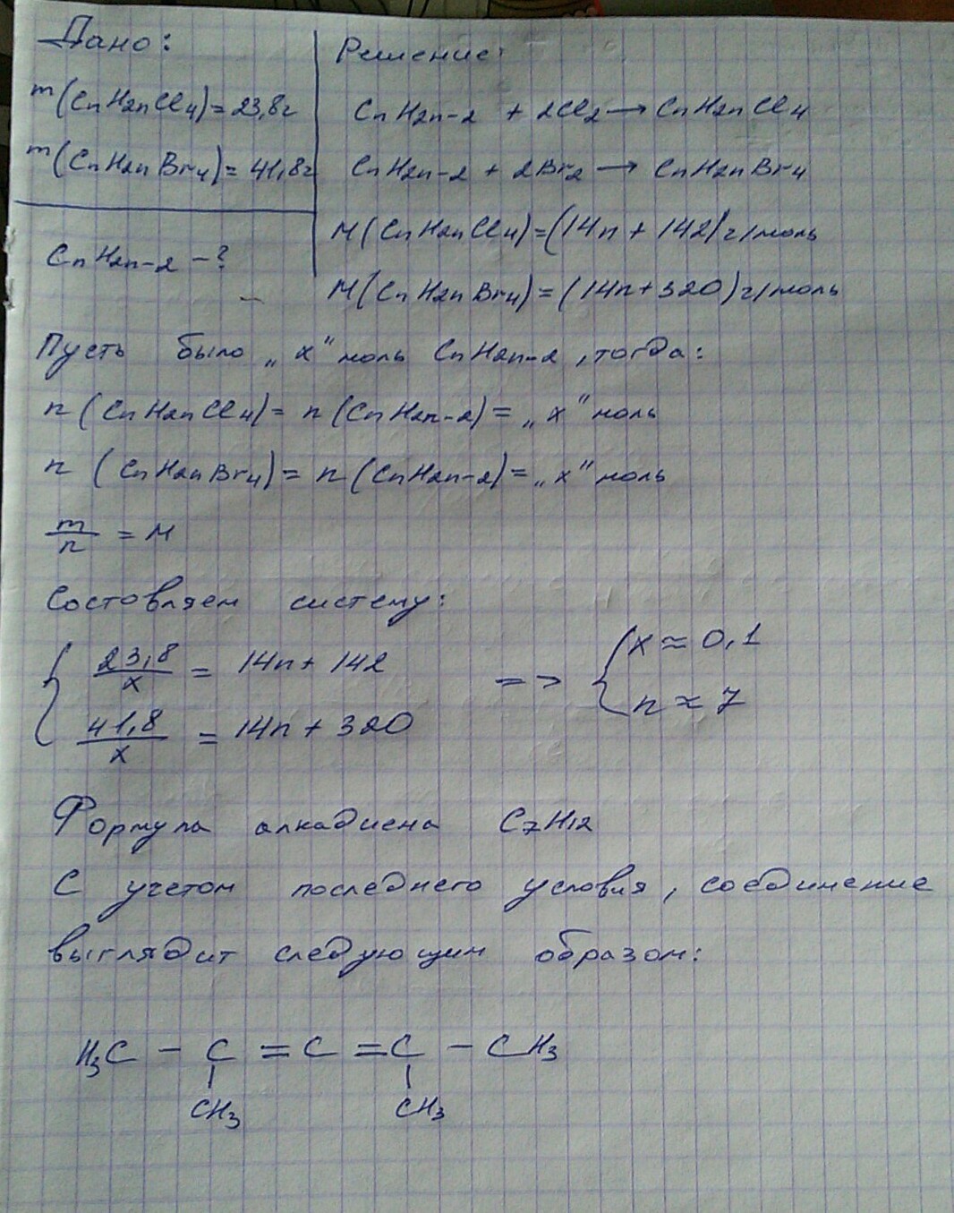 Некоторое количество алкадиена дает с избытком хлора 23,8 г тетрахлорида. То же его количество с избытком брома дает 41,8 г тетрабромида. Напишите структурную формулу алкадиена, если при замене любого атома водорода в его молекуле атомом хлора получается одно и то же соединение.