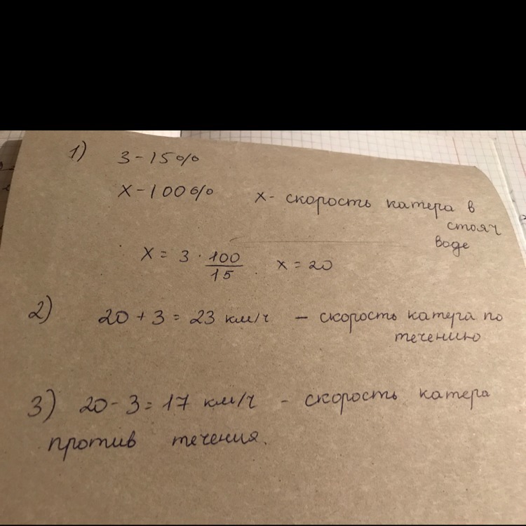 Скорость течения реки - 3 км/ч, что составляет 15% от собственной скорости катера. Найдите скорость катера по течению реки и против течения.