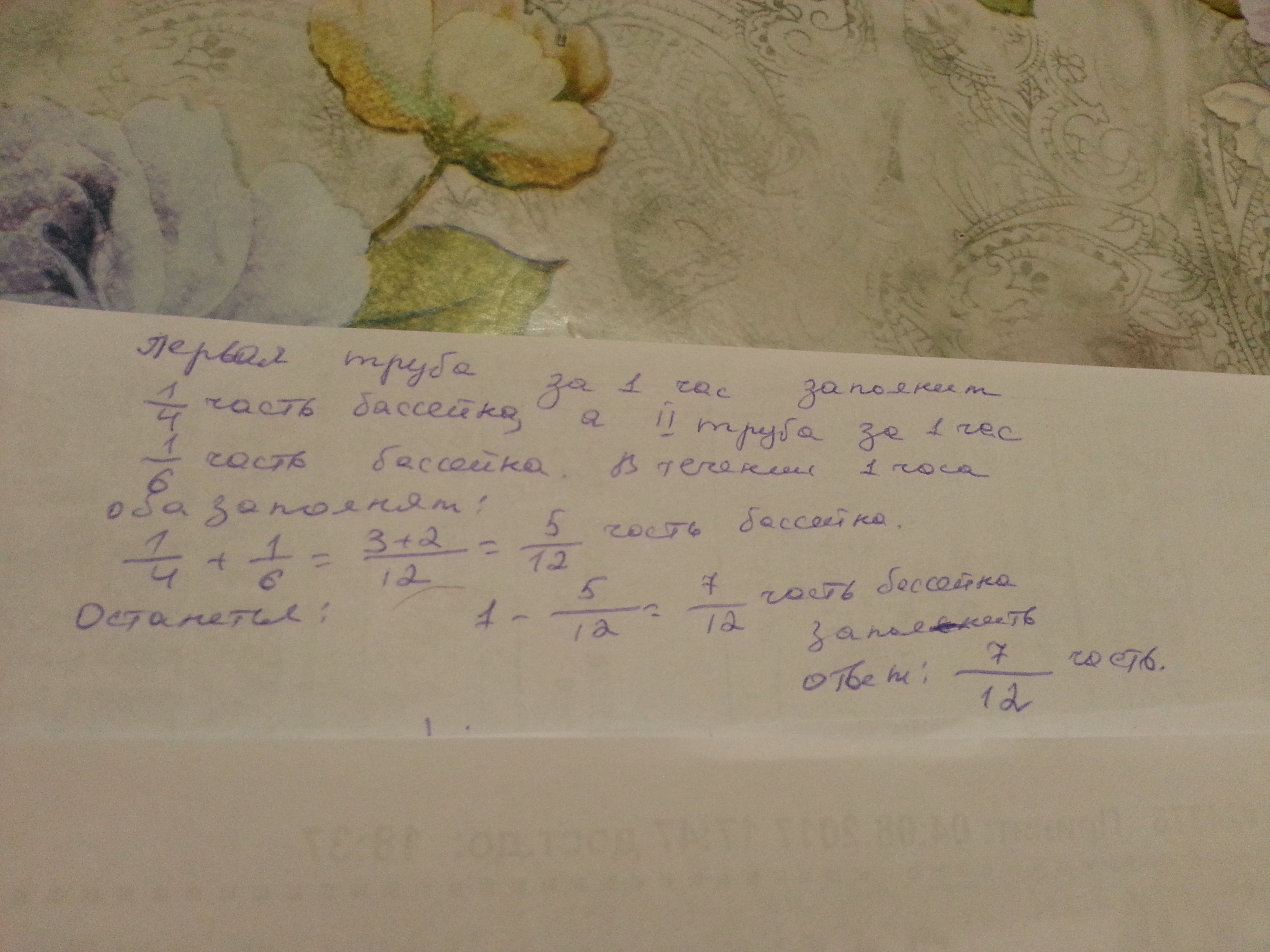Бассейн заполняется водой через первую трубу за 4 часа, а через вторую за 6 часов. Какую часть бассейна останется заполнить после совместной работы обеих труб в течение 1 часа?