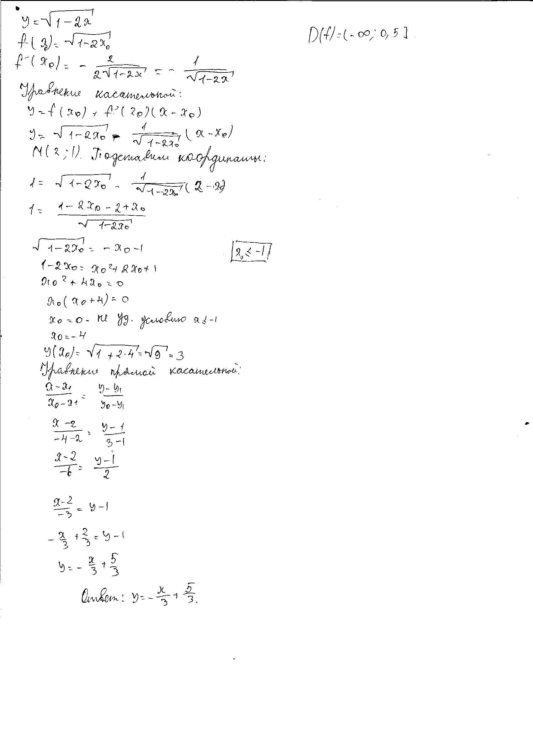 Напишите уравнение всех прямых, касательной к графику функции у=√1-2x ,проходящей через точку М(2;1).