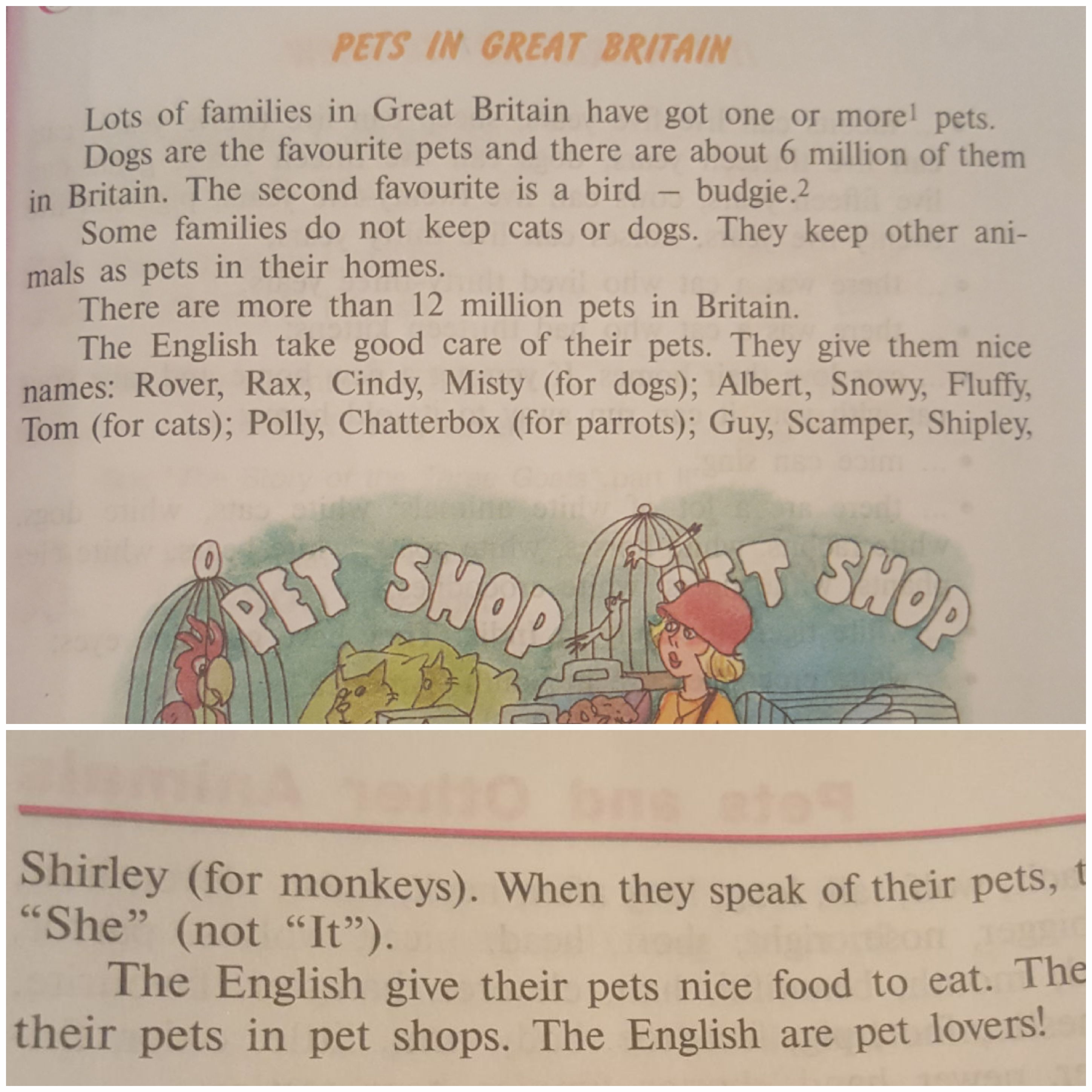 Lots of families in Great Britain have got pets. Dogs are the favorite pets. The second favorite is a bird - budgie. There are more than 12 million pets in Britain. The English take good care of their pets.They give them nice names: Rover, Rax, Cindy, Misty (for dogs); Albert, Snowy, Fluffy, Tom (for cats);Polly , Chatterbox(for parrots); Guy, Scamper,Shipley, Shirley (for monkeys) The English are pet lovers!