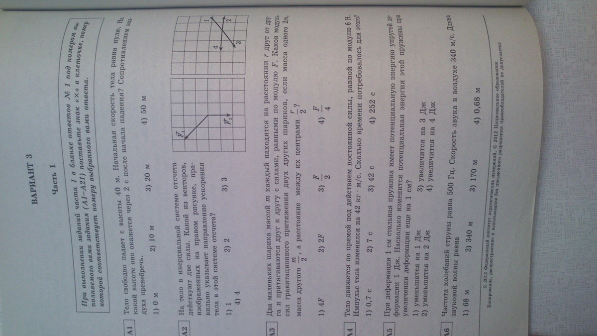 А2. По второму закону Ньютона, в инерциальной системе отсчета ускорение тела сонаправлено с равнодействующей всех сил, действующих на тело. Из рисунков видно, что сумма векторов F1 и F2 сонаправлена с вектором 3.