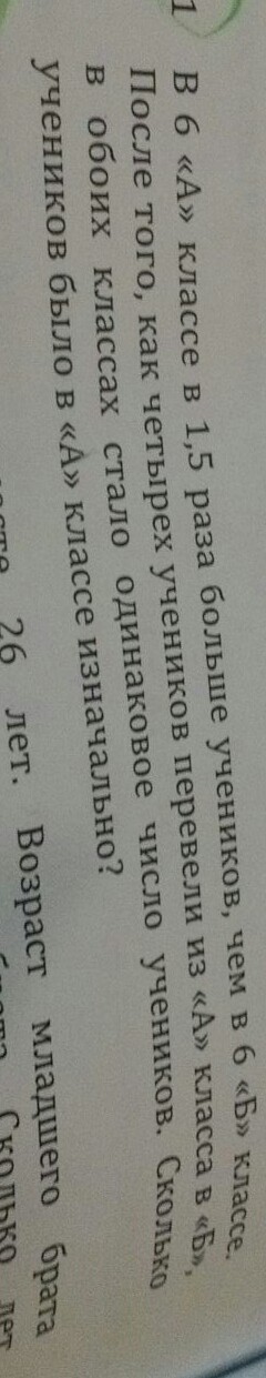 2. после того, как из класса "А" перевели 4 ученика в класс "Б", в классе "А" стало (1,5х-4) учеников, а в классе "Б" соответсвенно (х+4) учеников.