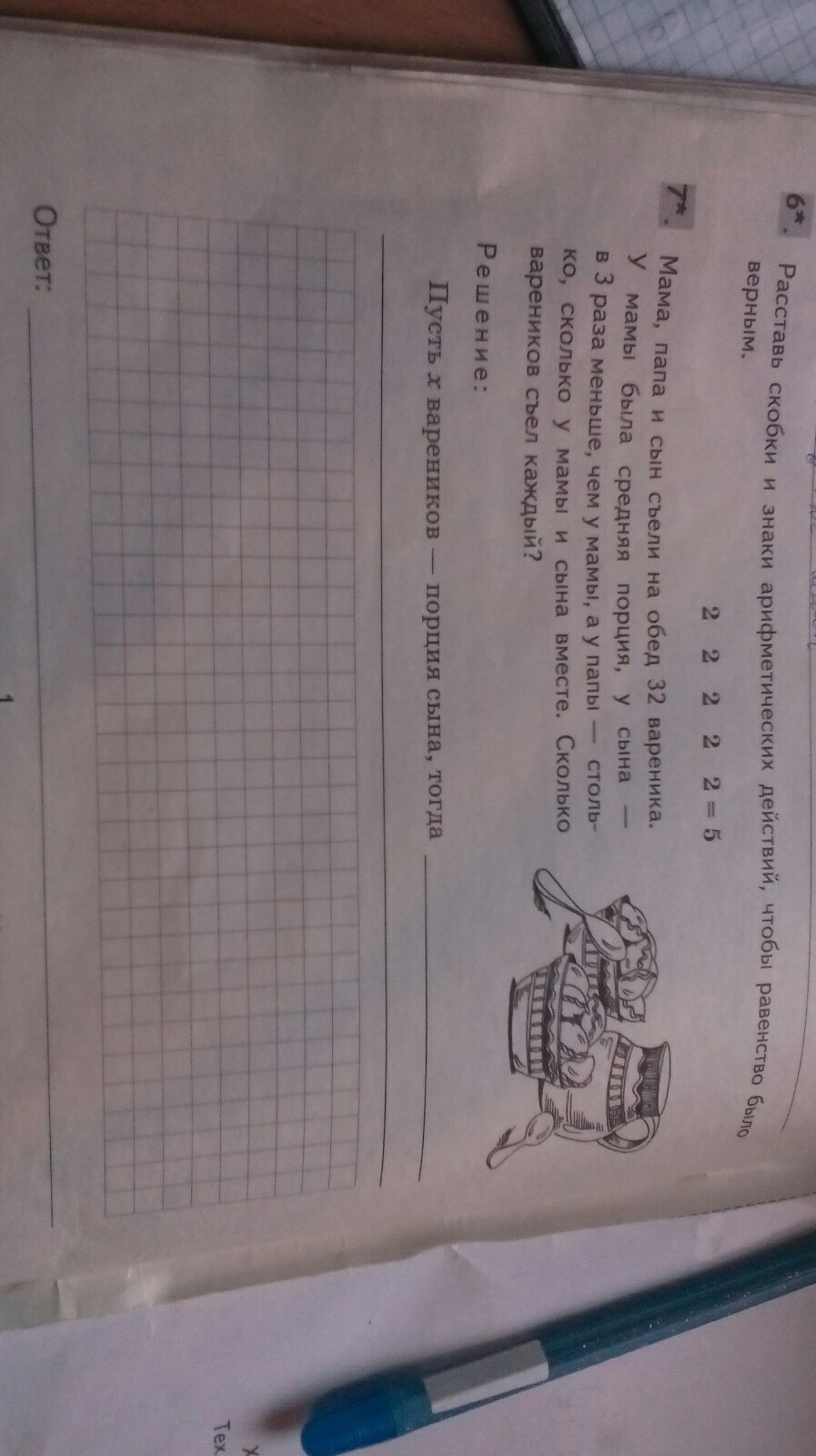 Сын съел 4 вареника, мама - 12 в. и папа - 16в.
