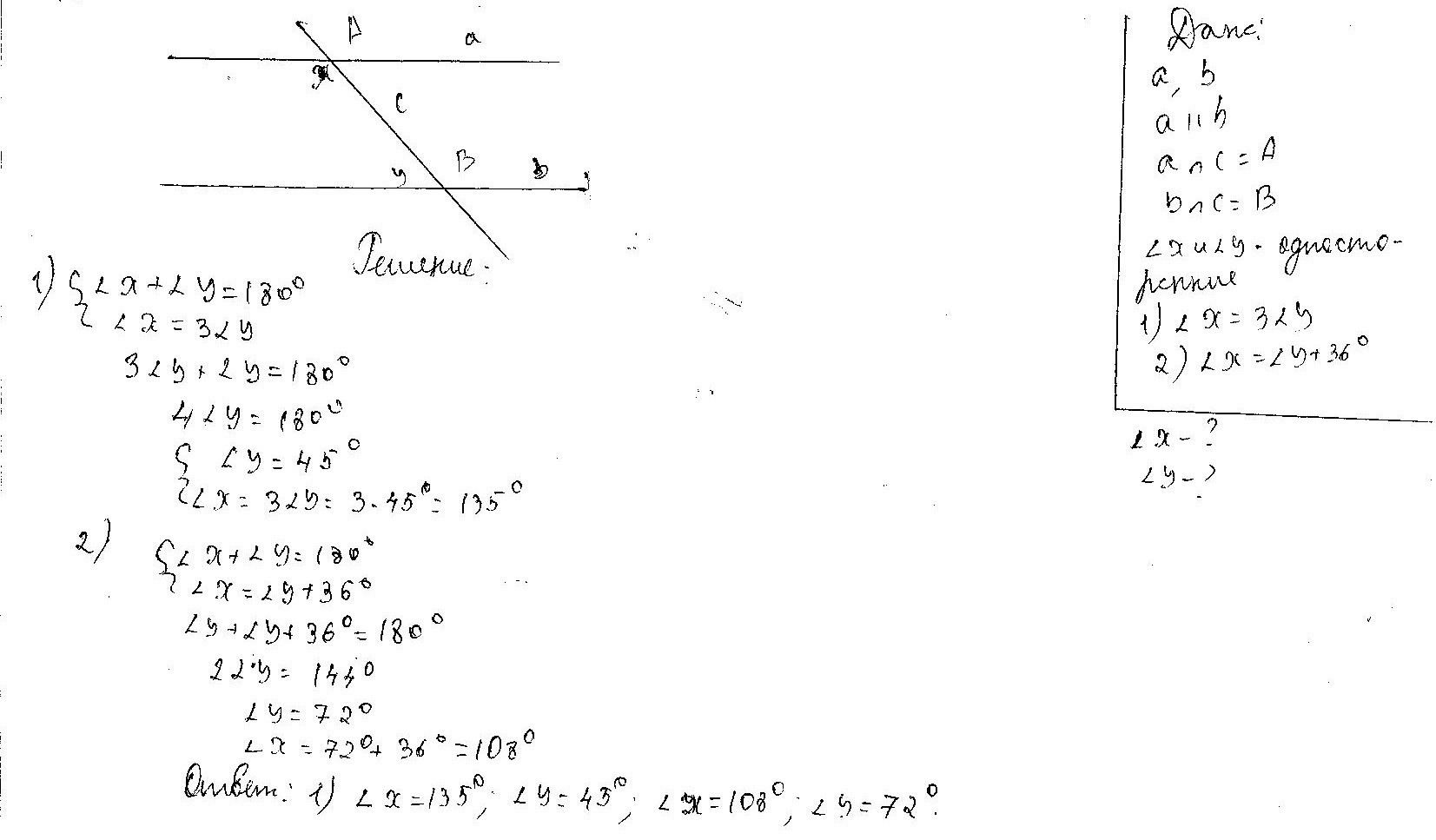Сумма внутренних односторонних углы при двух параллельных прямых и секущей равна 180гр