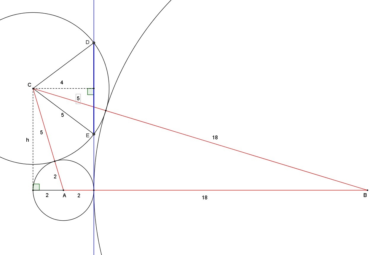 S(ABC)=√(25·5·18·2)=30√5. Расстояние h от точки С до прямой AB равно h=2S/AB=3√5. Расстояние от С до общей внутренней касательной к окр. А и В равно 2+√(AC²-h²)=2+√(49-45)=4. Значит искомая хорда DE равна 2√(5²-4²)=6.