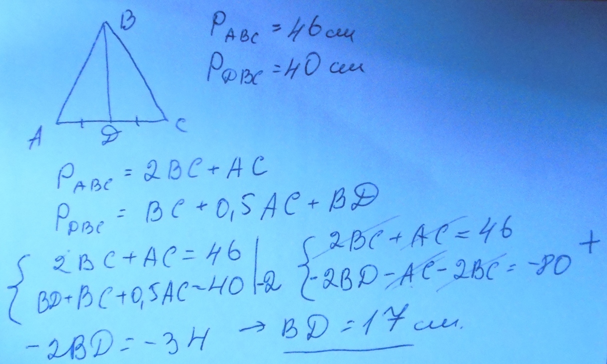 bd медиана равнобедренного треугольник авс с основанием ас . найдите вd, если периметры треугольников abc и свd равны, соответственно 46 см и 40 см