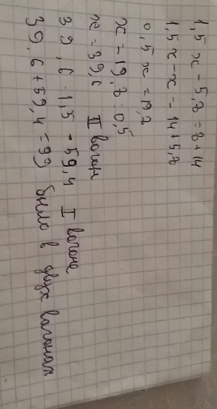 в первом вагоне в 1,5 раза больше груз, чем во втором. после того, как из первого вагона выгрузили 5,8 т, то в нем стало на 14,2 т больше , чем во втором.