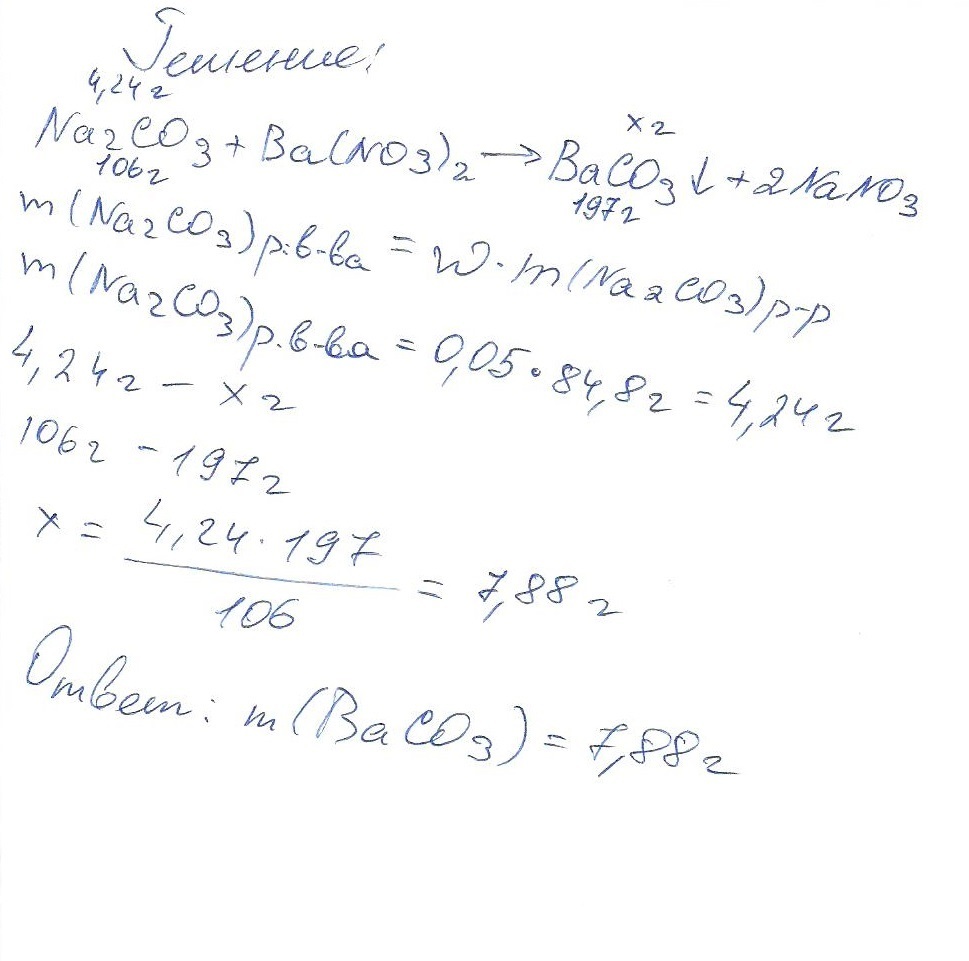 К раствору карбоната натрия массой 84,8 г и массовой долей соли 5% прилили избыток раствора нитрата бария. Вычислите массу образовавшегося осадка.