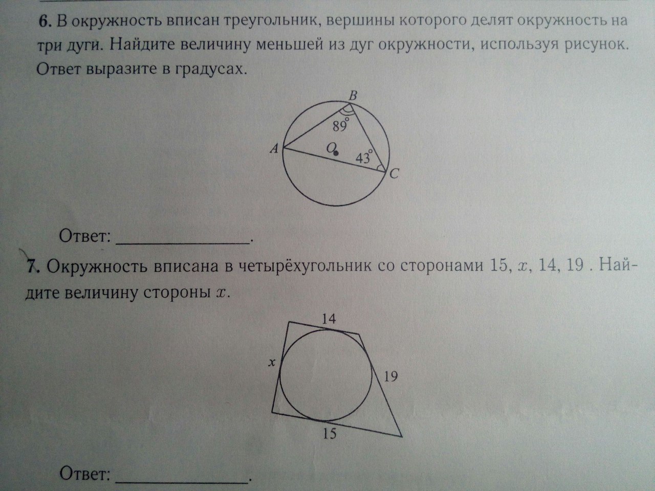 "В окружность вписан треугольник, вершины которого делят окружность на три дуги. Найдите величину меньшей из дуг окружности, используя рисунок (под номером 6) Ответ выразите в градусах."