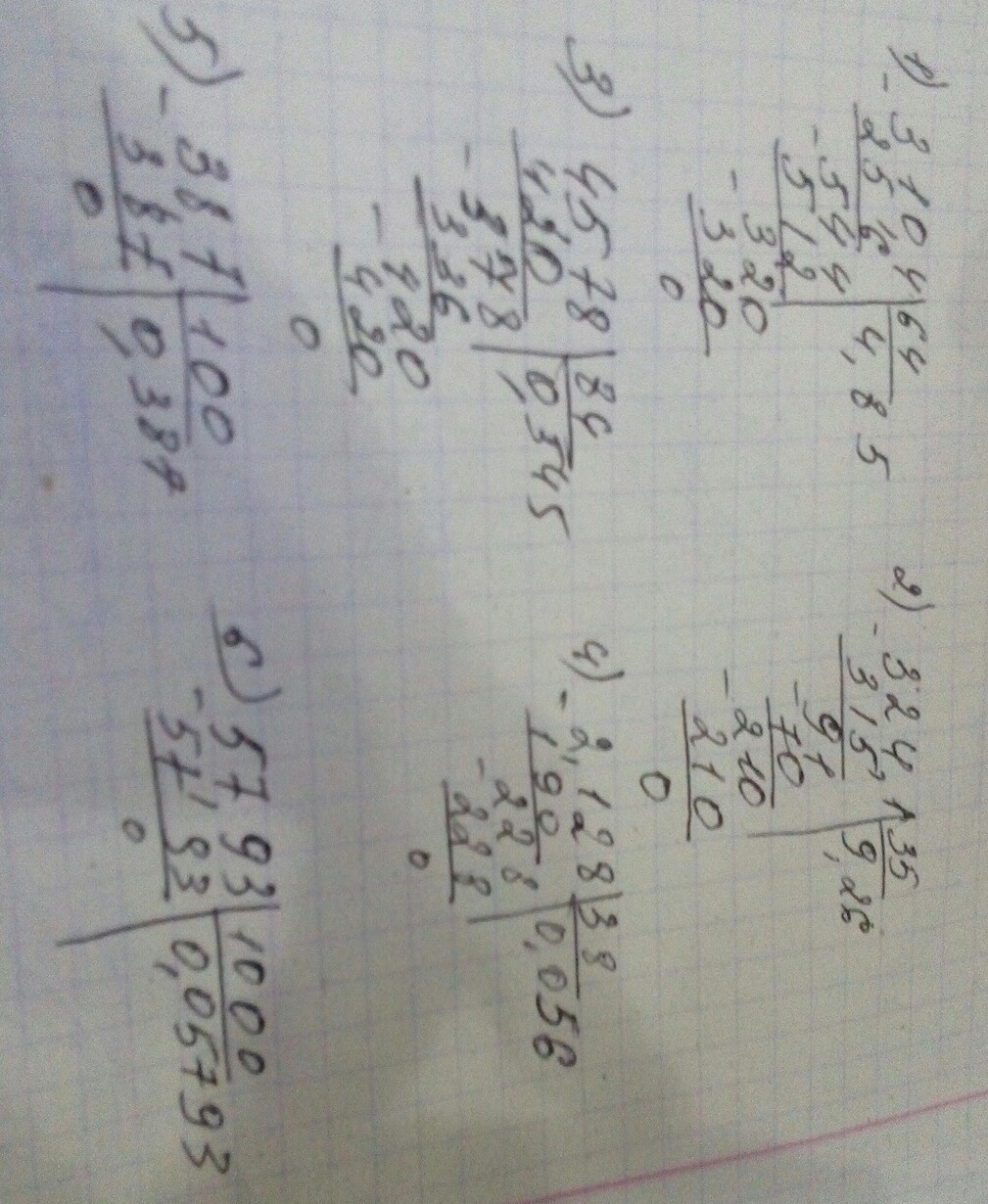 а) 310,4:64 б) 324,1:35 в) 45,78:84 г) 2,128:38 д) 38,7:100 е) 57, 93:1000.