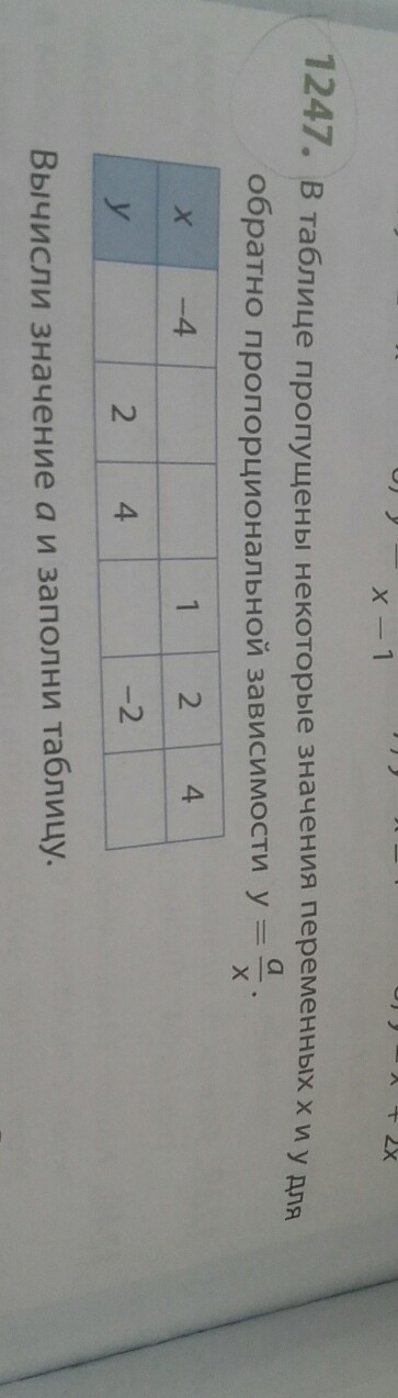 Если y=a/x , то а=yx. Используя колонку в которой известно и х и у находим а = 2*-2= - 4