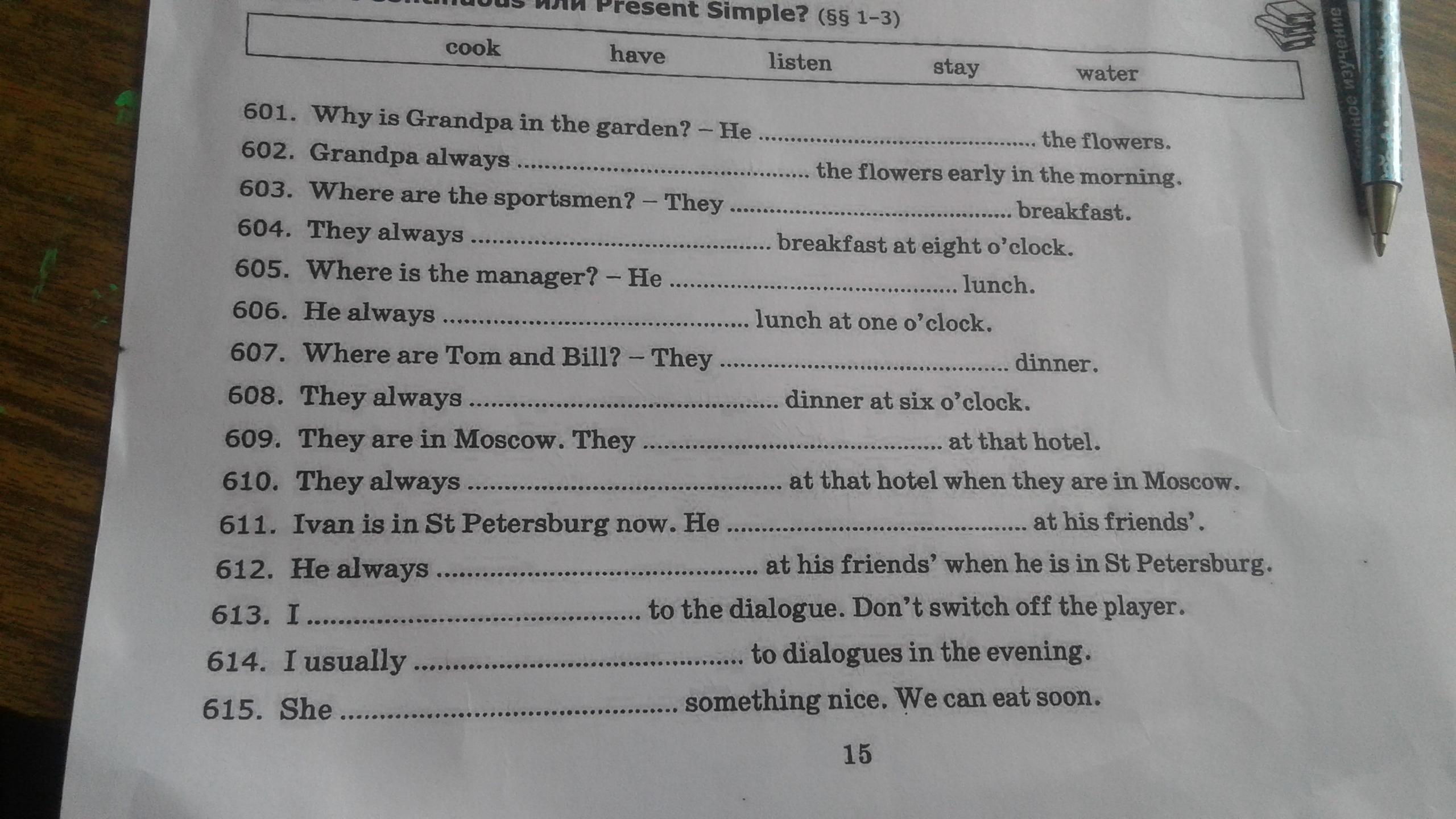 1 is watering 2 waters 3 are having 4 have 5 is having 6 has 7 are having 8 have 9 are staying 10 stay 11 is staying 12 stays 13 am listening 14 listen 15 is cooking