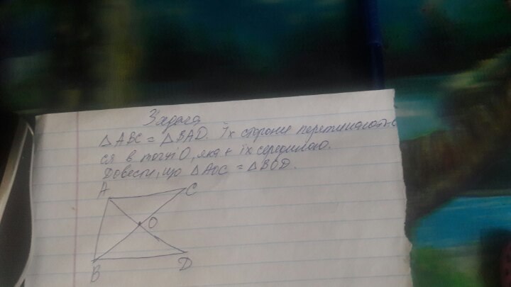 Треугольник АВС = Треугольнику ВАD. Из стороны пересекаются в точке О, которая является их серединой. Доведите, что Треугольник АОС = Треугольнику ВОD