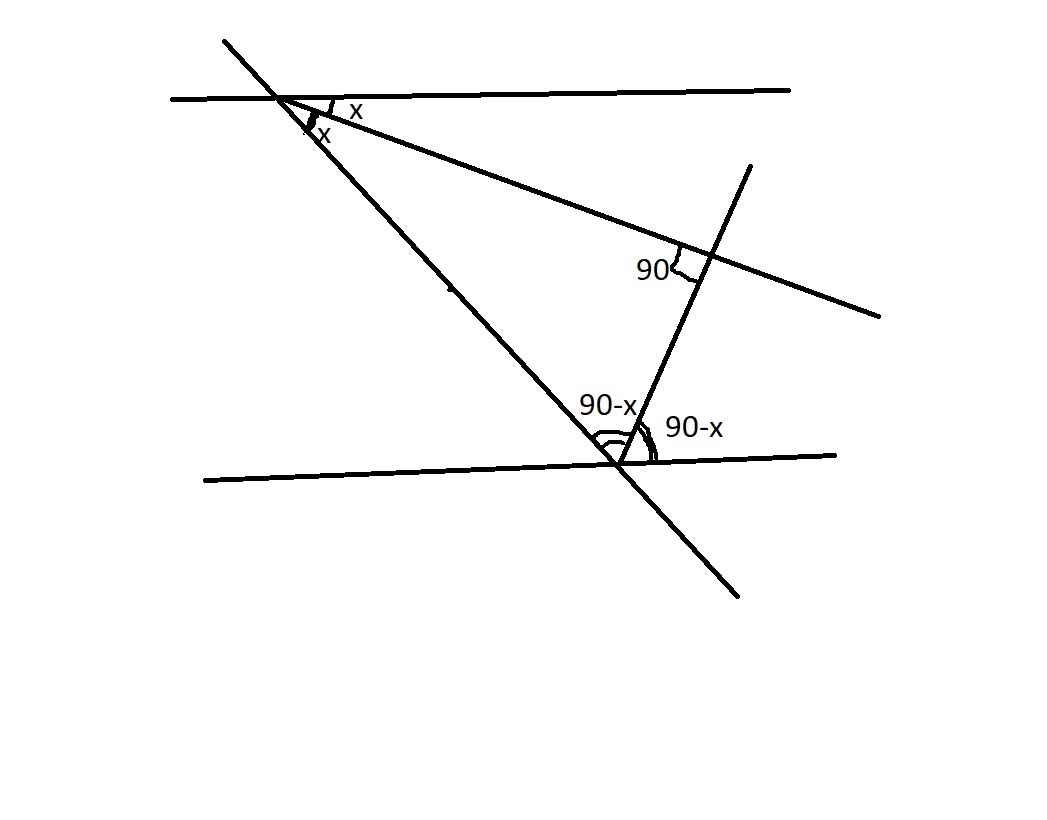 Найдите угол между биссектрисами внутренних односторонних углов, образованных парой параллельных прямых и секущей.