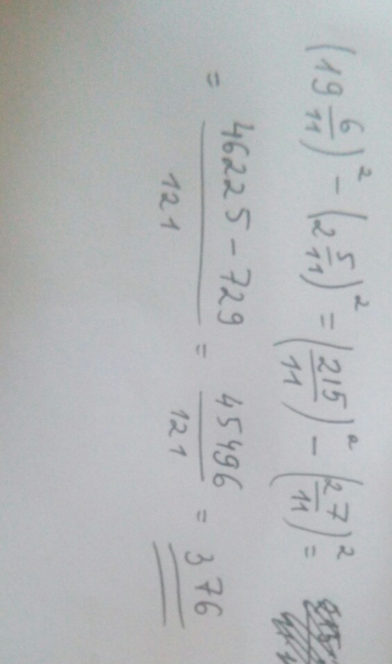 (19 6/11-2 5/11)(19 6/11+2 5/11)= 17 1/11*22 = 376