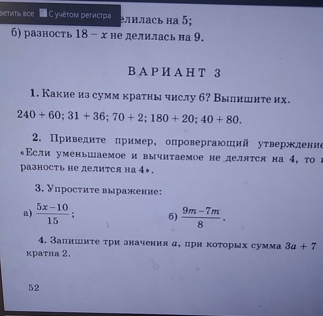 В этом примере уменьшаемое 19 и вычитаемое 7 не делятся на 4, но их разность 12 на 4 делится, что опровергает утверждение.