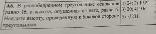 В равнобедренном треугольнике основание равно 16, а высота, опущенная на него, равна 6. Найдите высоту, проведенную к боковой стороне треугольника.