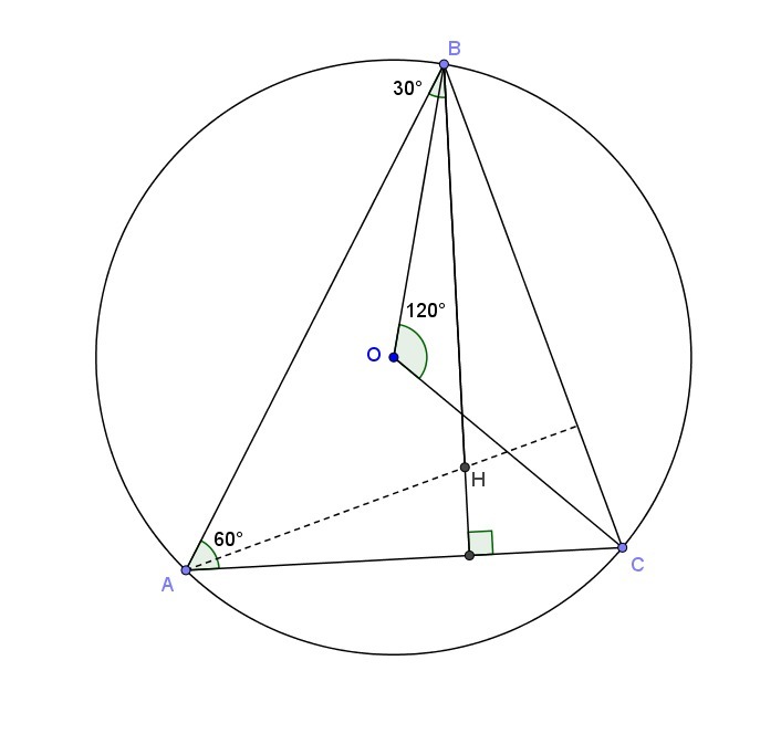 Пусть H и O — ортоцентр и центр описанной окружности остроугольного треугольника ABC соответственно. Известно, что ∠ABH=30∘, найдите градусную величину угла ∠OBC.
