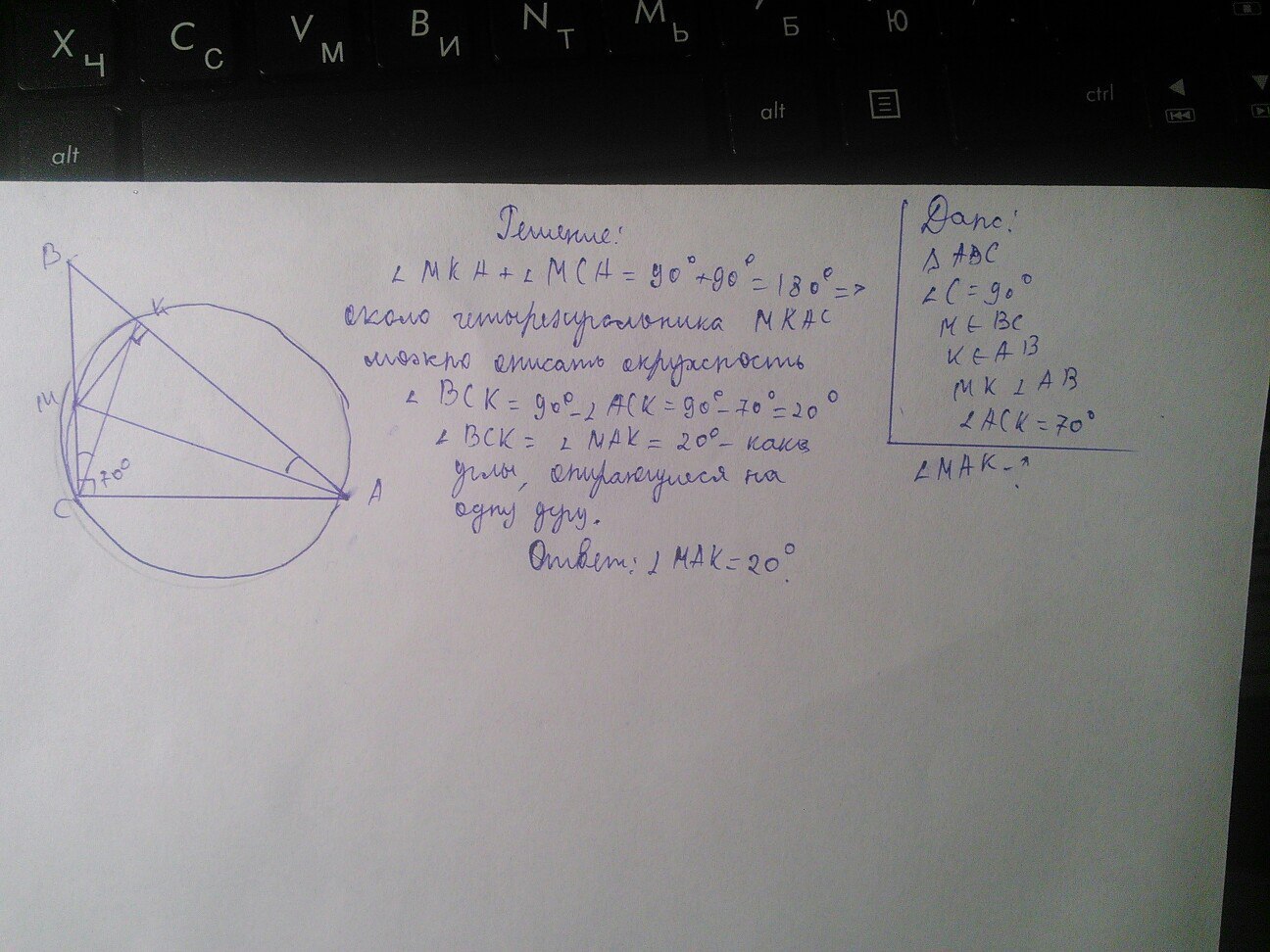 Из произвольной точки M катета BC прямоугольного треугольника ABC на гипотенузу AB опущен перпендикуляр MK. Известно, что ∠ACK=70∘, найдите градусную меру угла ∠MAK