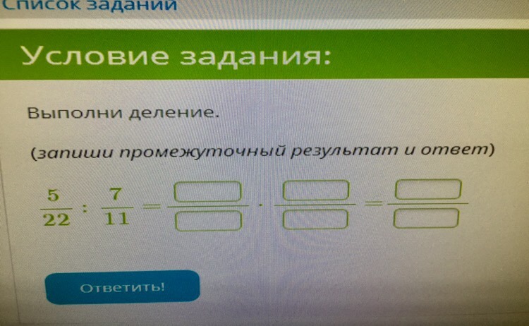 5/22 : 7/11 = 5/22 × 11/7 = 5/14