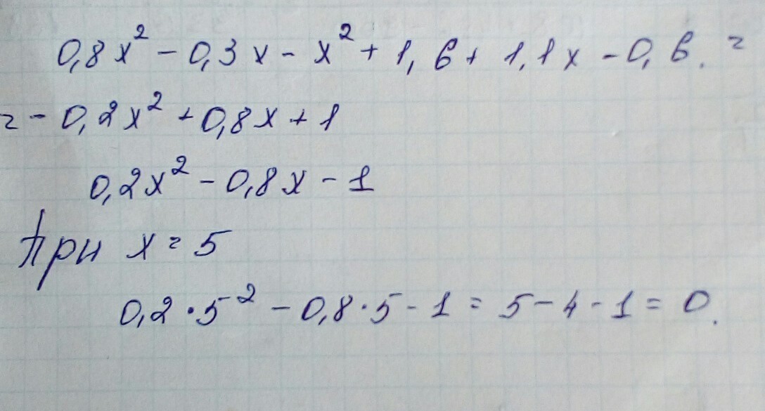 0,8x^2 - 0,3x - x^2 + 1,6 + 1,1x - 0,6, если x = 5