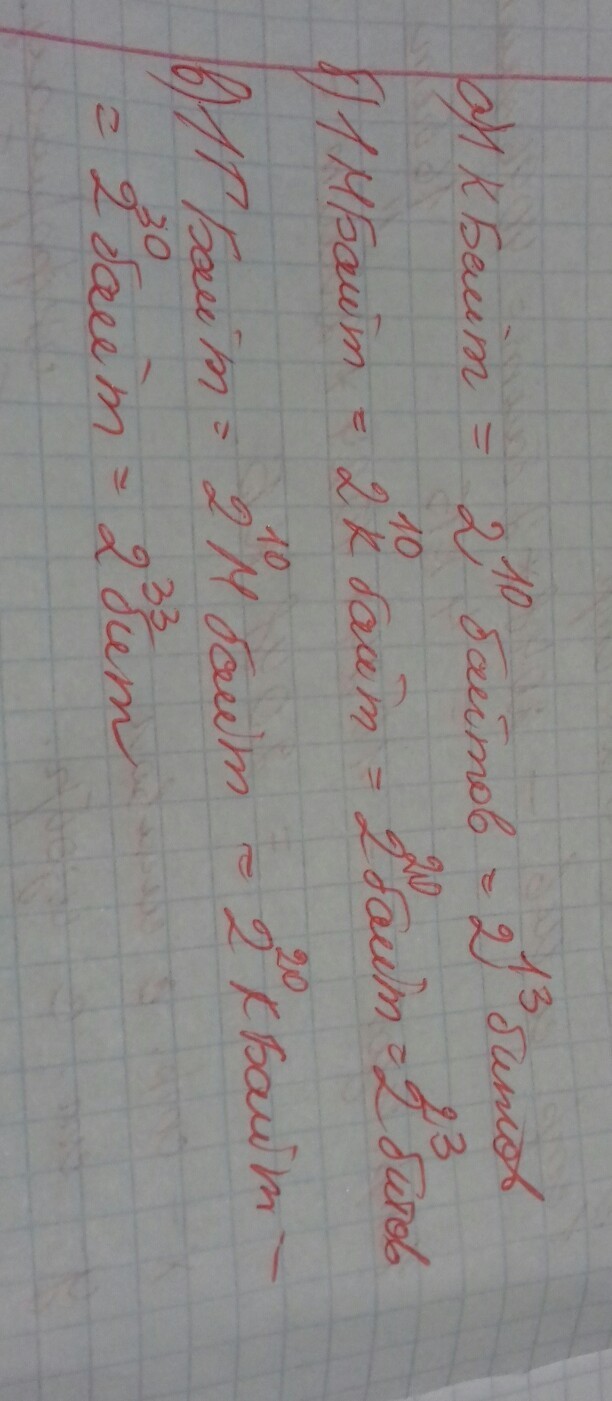 в) 1 Гбайт = 2 Мбайт = 2 Кбайт = 2 байтов = 2 битов