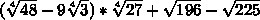 48 = 2^4 * 3, 27 = 3³, 196 = (14)², 225 = 15² тогда получим( 2 корня четвёртой степени из 3 - 9 корней четвёртой степени из 3) * на корень четвёртой степени из 3³) + 14 - 15 =( - 7 корней четвёртой степени их 3) * на корень четвёртой степени из 3³) + 14 - 15 = ( - 7 корней четвёртой степени из 3 в четвёртой степени) + 14 - 15 = -7 * 3 + 14 - 15 = -21 + 14 - 15 = - 22
