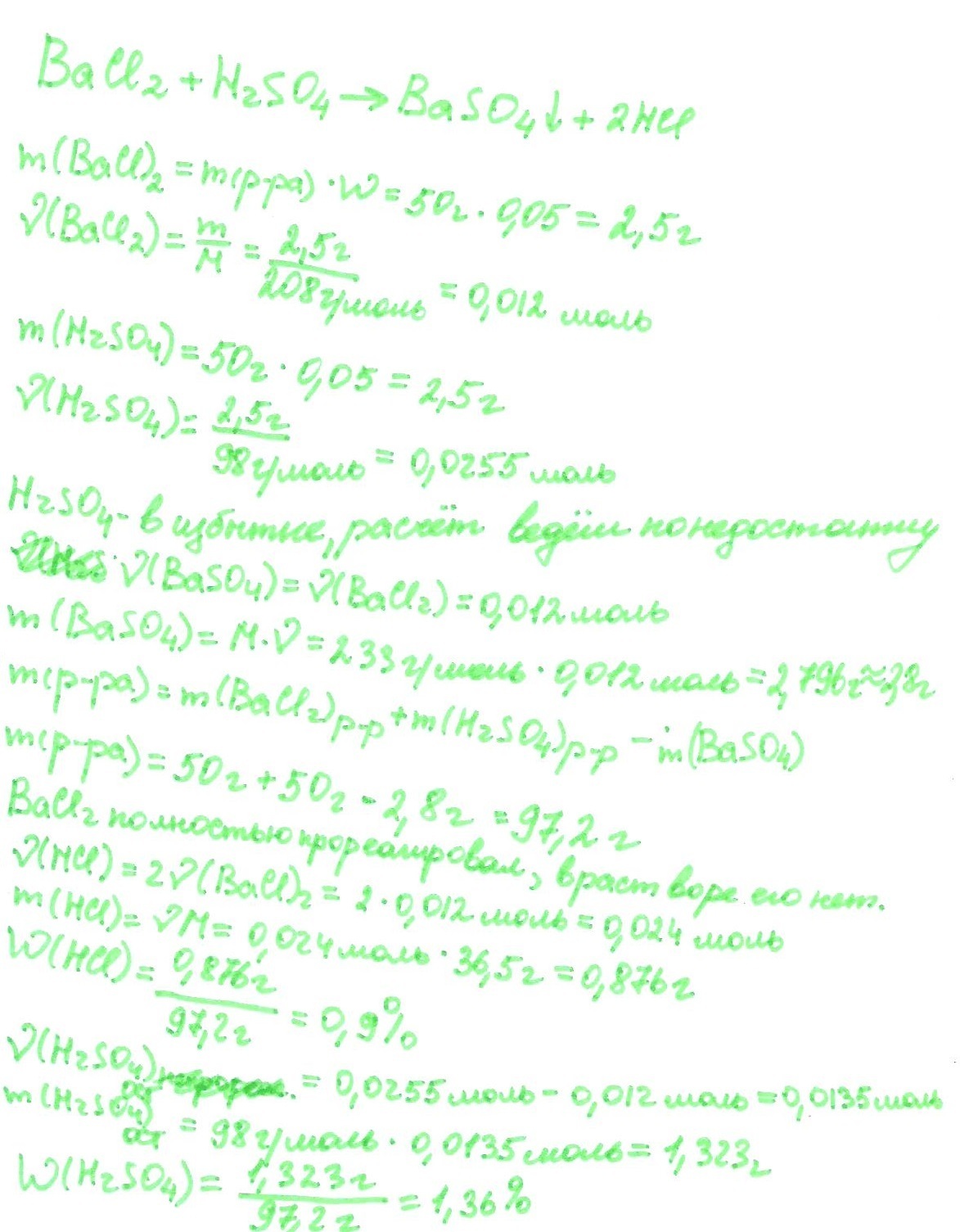Помогите, пожалуйста, решить задачу. К 50 г 5% р-оа хлорида бария прибавили 50 г 5% р-ра серной кислоты. Определите массовые доли соединений содержащихся в р-ре после отделения осадка!