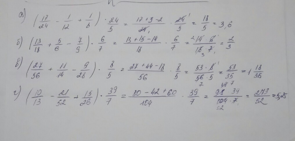 Выполните действия а(17/24-1/12+1/8)*24:5; б(13/18+5/6-7/9)*6:7; в(27/56+11/14-9/28)*8:5 г (10/13-21/52+15/26)*39:7.