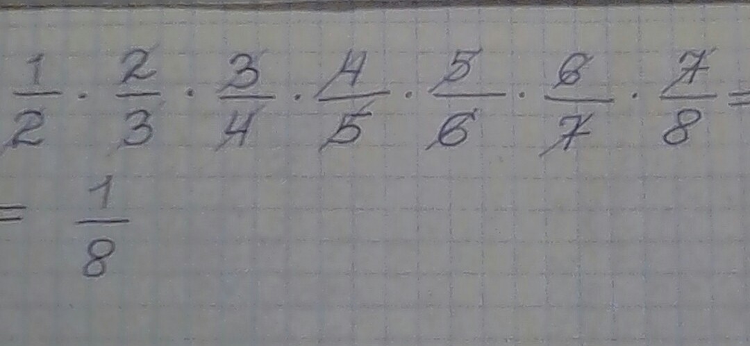 1/2 * 2/3 * 3/4 * 4/5 * 5/6 * 6/7 * 7/8 = 1/8