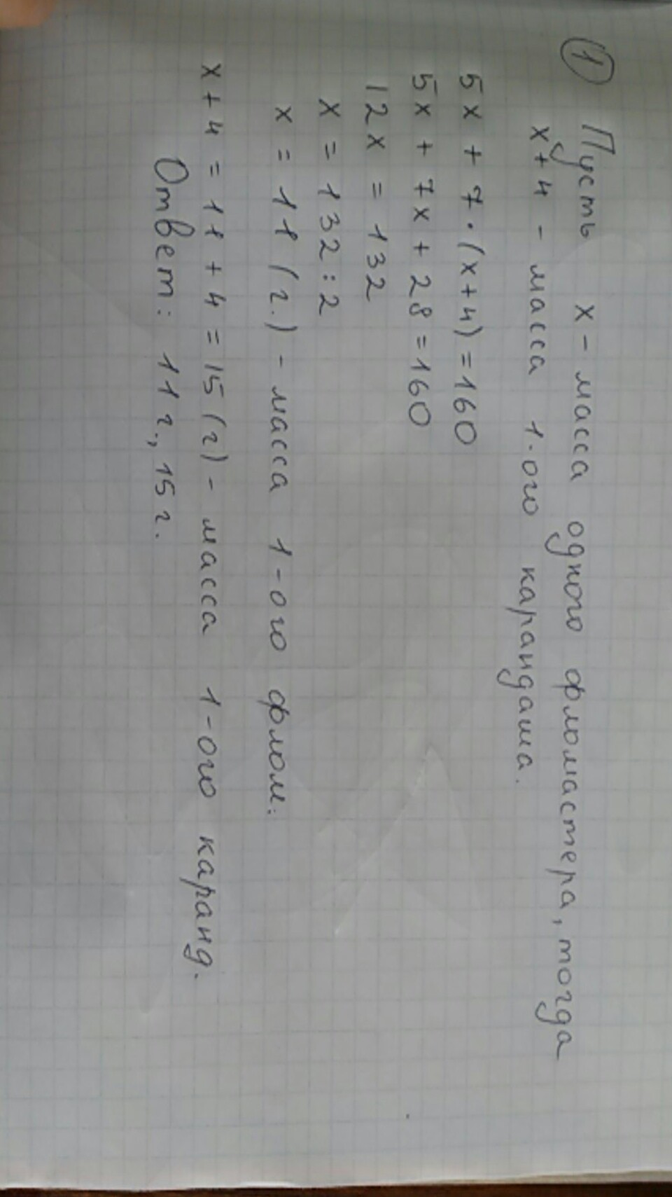 1. 7 одинаковых карандашей и 5 одинаковых фломастеров имеют массу 160г. Масса одного фломастера на 4г. меньше массы одного карандаша. найдите массу одного карандаша и одного фломастера.