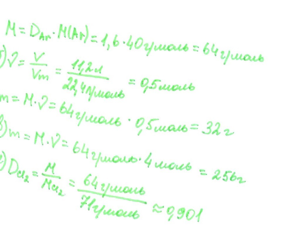 Г) D(Cl2) = M(в-ва) / M(Cl2) = 64 г/моль / 71 г/моль = 0,901