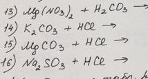 Mg(NO3)2+H2CO3=MgCO3 (осадок) +2HNO3K2CO3+2HCl=2KCl+CO2(газ) +H2OMgCO3+2HCl=MgCl2+CO2(газ)+H2ONa2SO3+2HCl=2NaCl+SO2(сернистый газ) +H2O