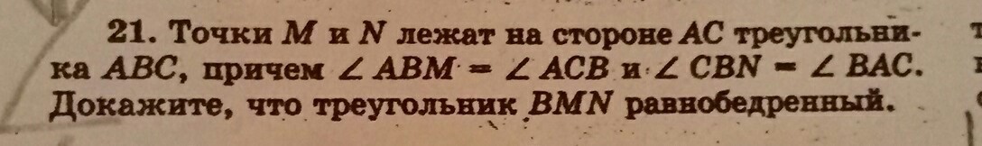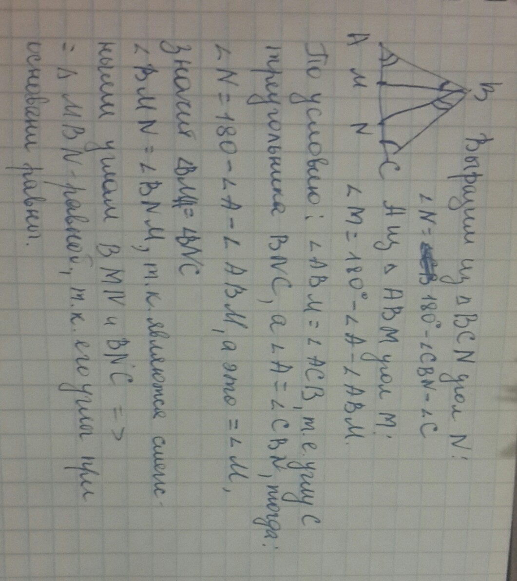 Точки т. M i N лежат на отрезке АС треугольника ΔАВС. По условию задачи ∠ABM=∠ACB, отсюда ∠CBN=∠BAC ( Как внутренние разносторонние углы.) То треугольники ΔABM=ΔCBN за вторым признаком равенства треугольников.
