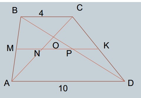 ABCD- трапеция ; MK параллельно AD; AC =12 см; BC=6 см; AD=10 см ; Найти : NP ; NO .На рисунке опечатка, BC=6