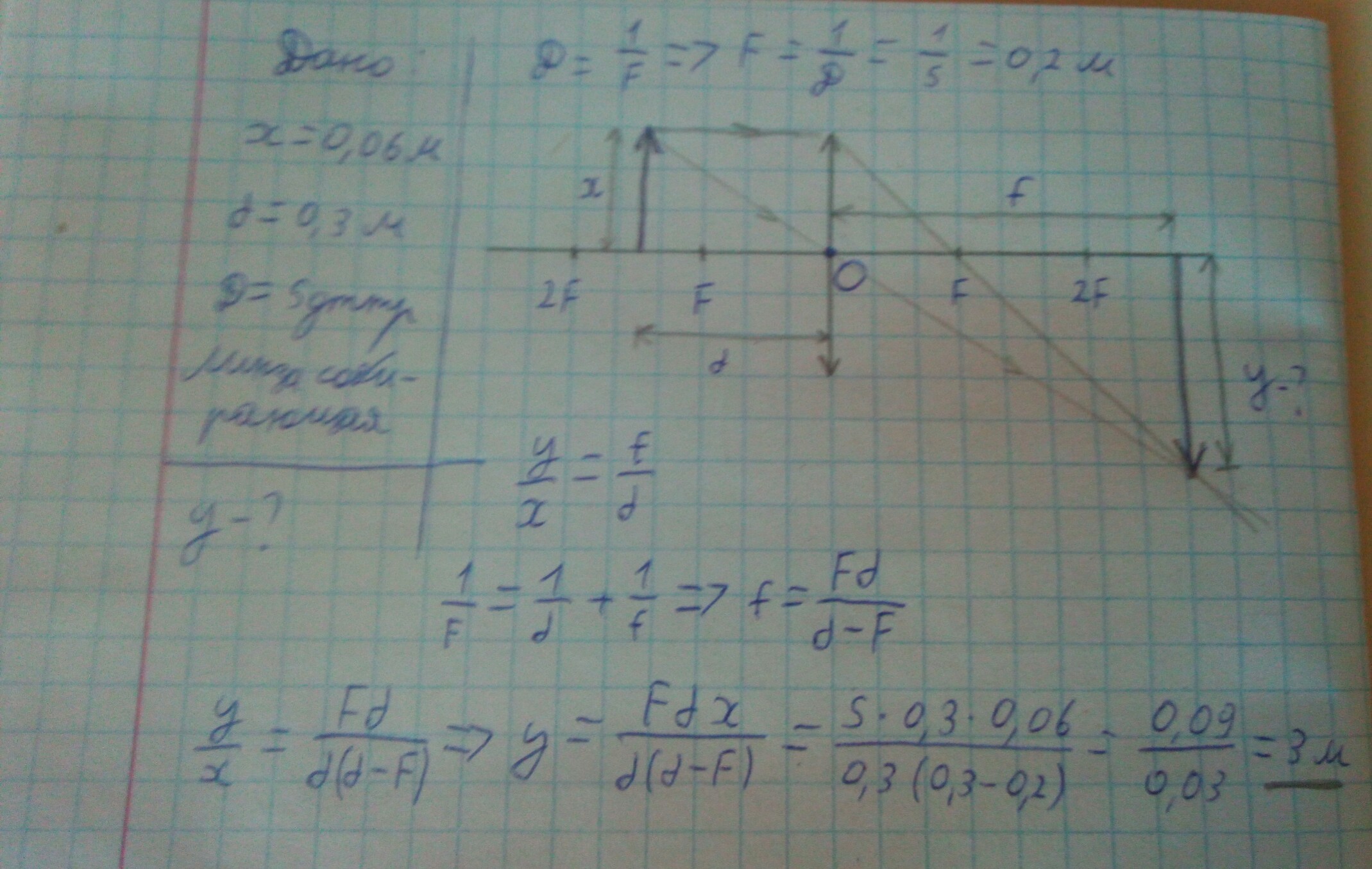 Предмет высотой 6 см расположен на главной оптической оси тонкой собирающей линзы на расстоянии 30 см от ее оптического центра .Оптическая сила линзы 5дптр. найдите высоту изображения