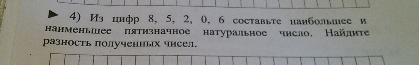 Наибольшим будет- 86520, наименьшим - 20568 . Далее разность этих чисел равна 65952